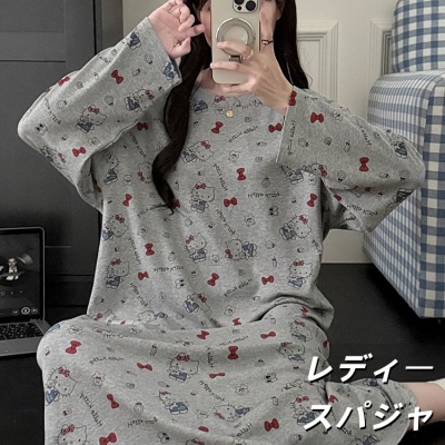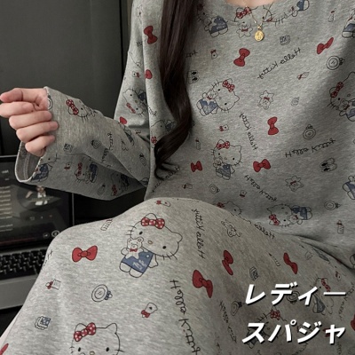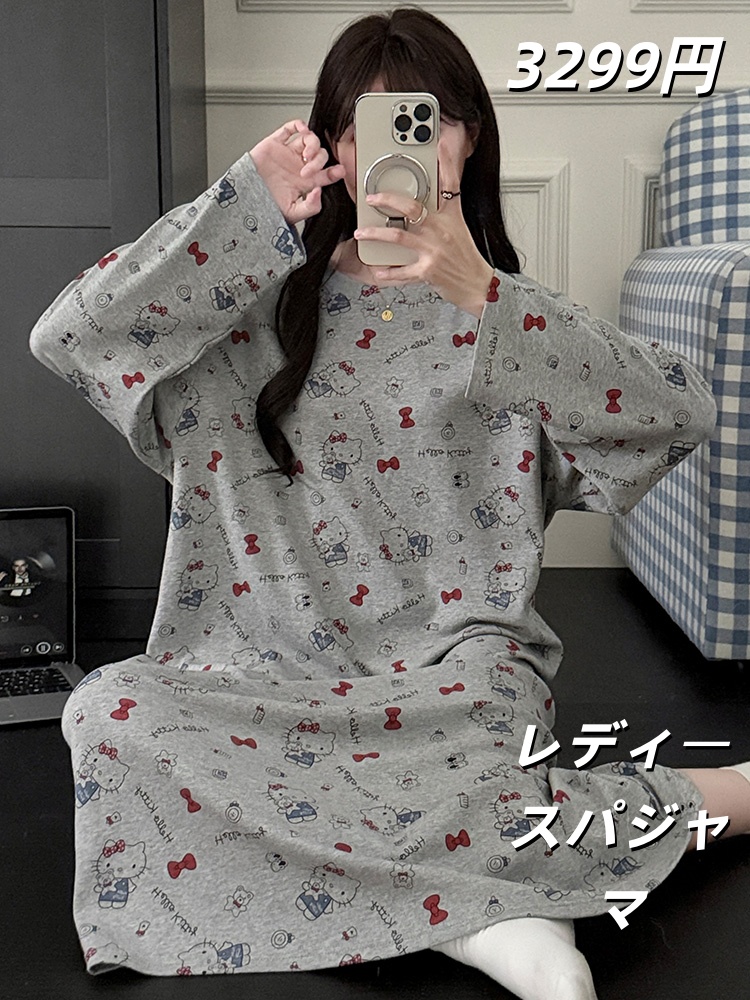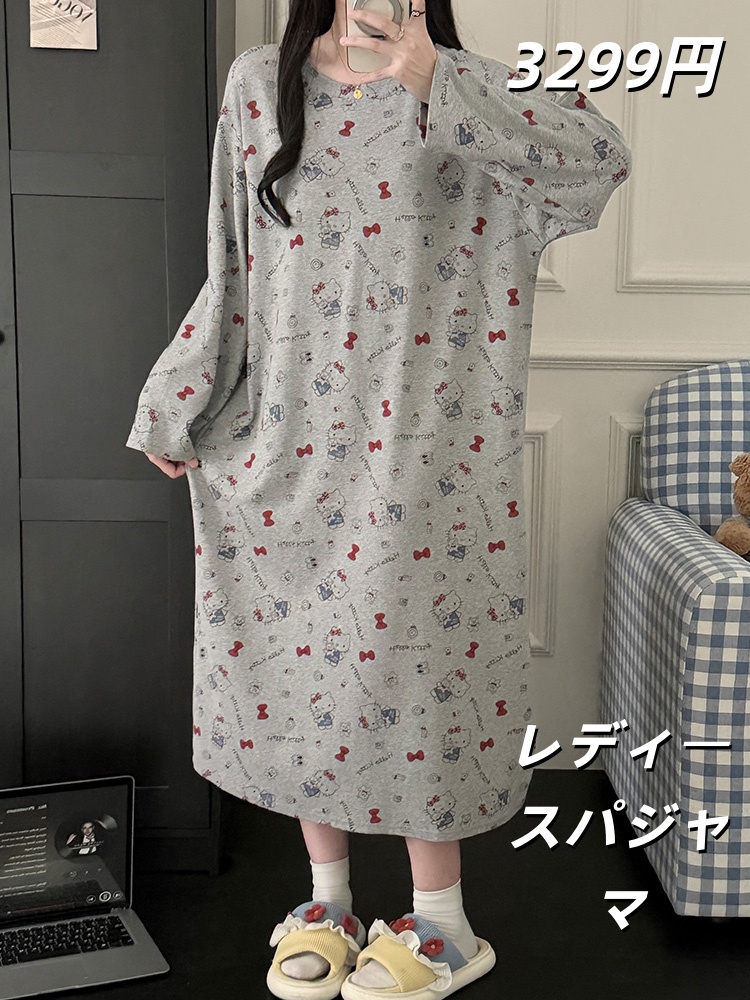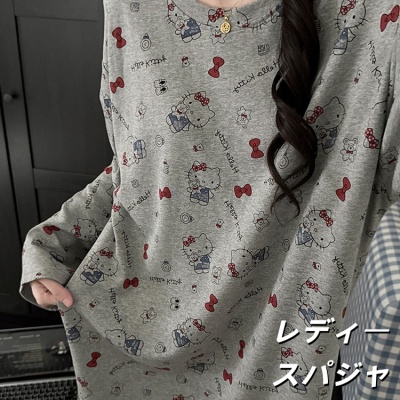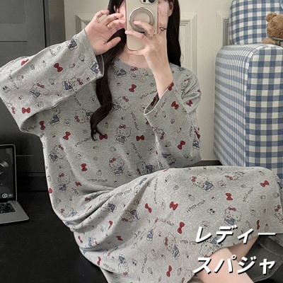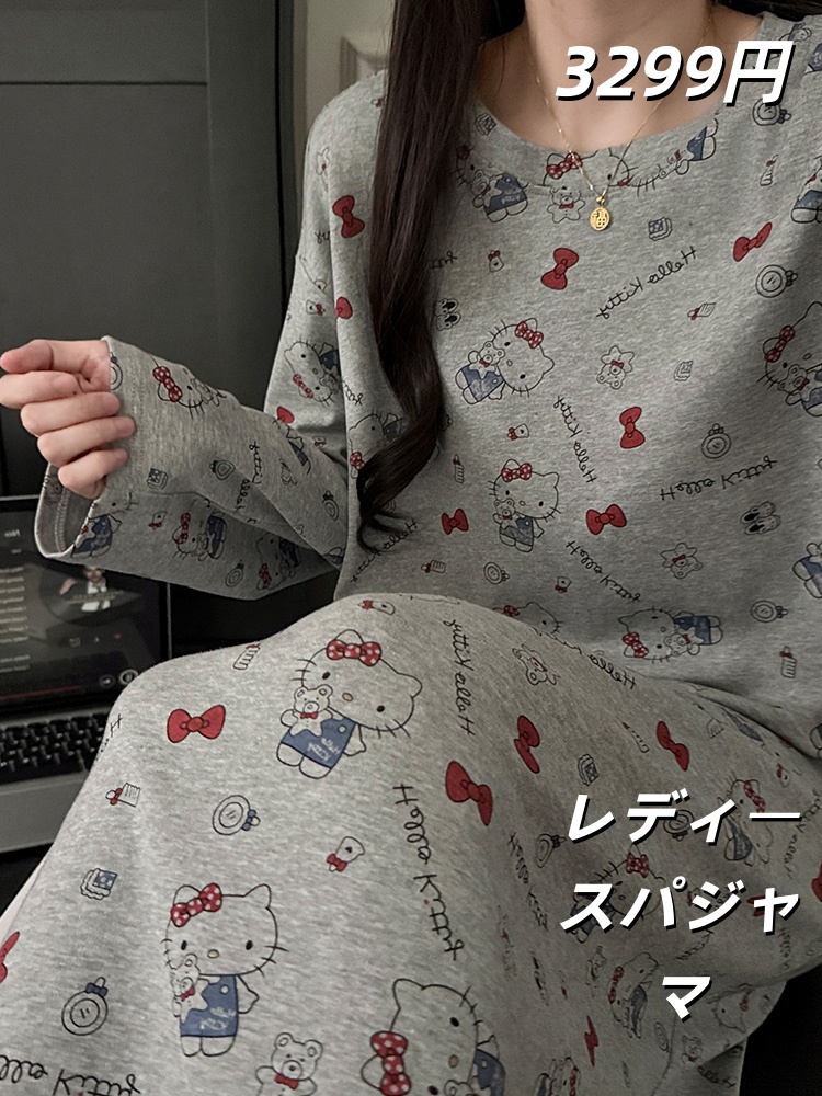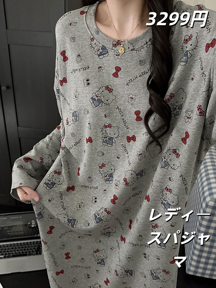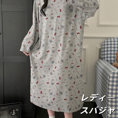 綿100%の長袖睡裙女春秋季2025新款卡通KT猫睡衣可爱休闲加大码家居服