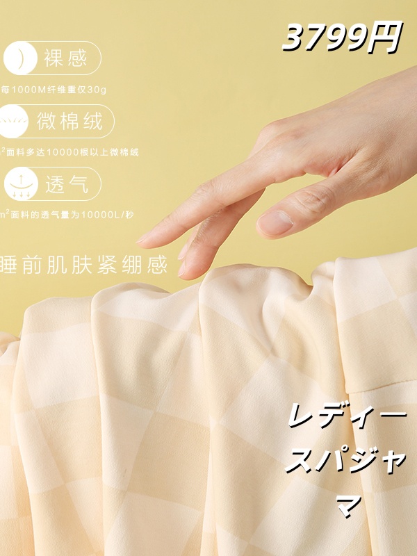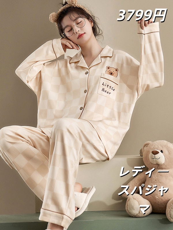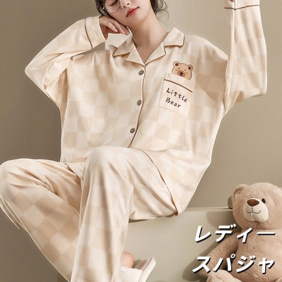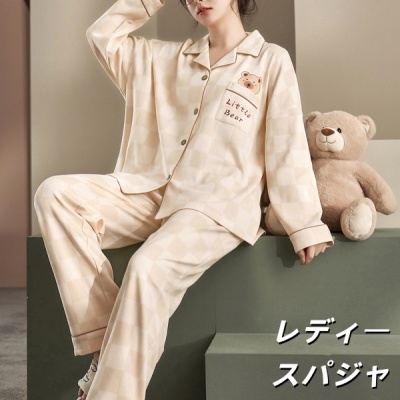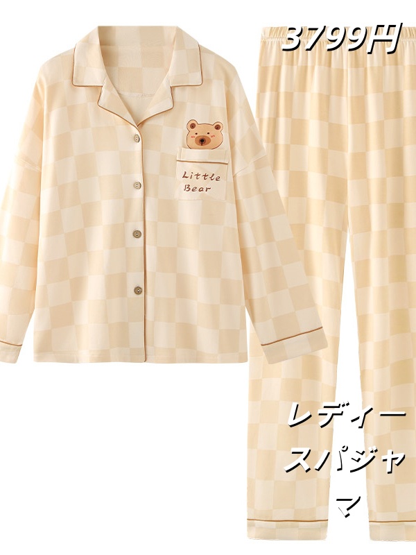 睡衣女春秋季無地の長袖棋盘格2025年新款带胸垫女生卡通家居服冬款