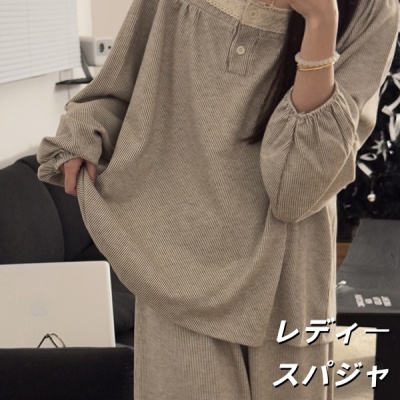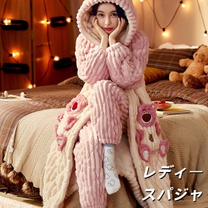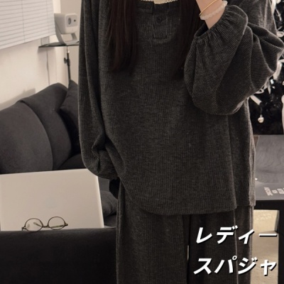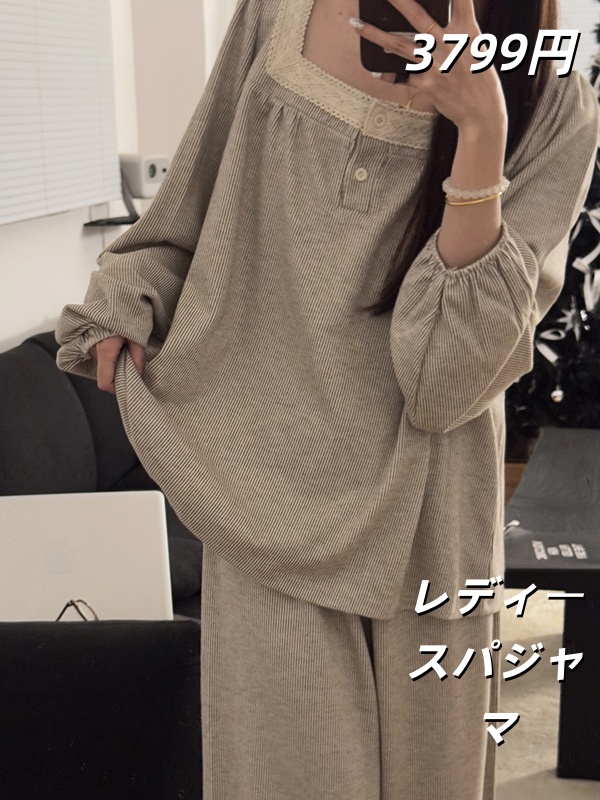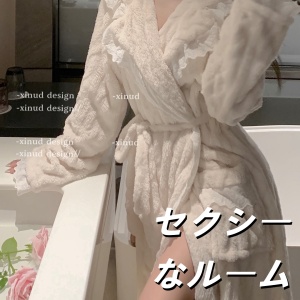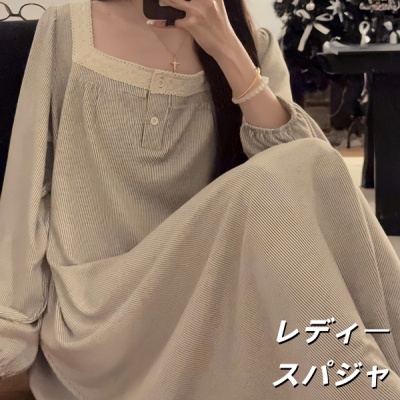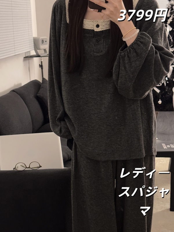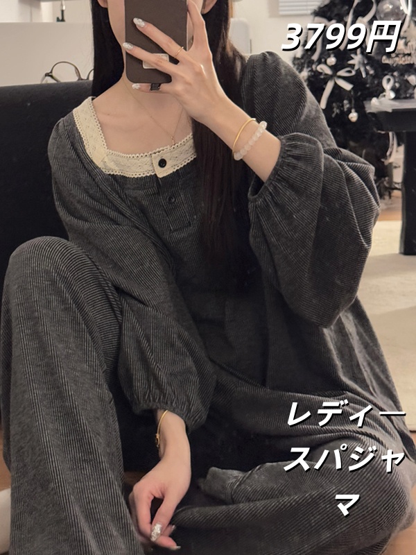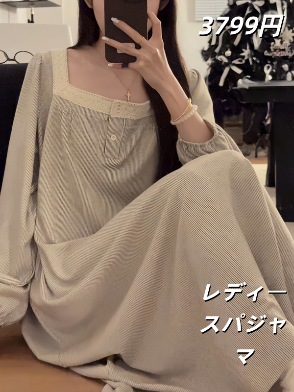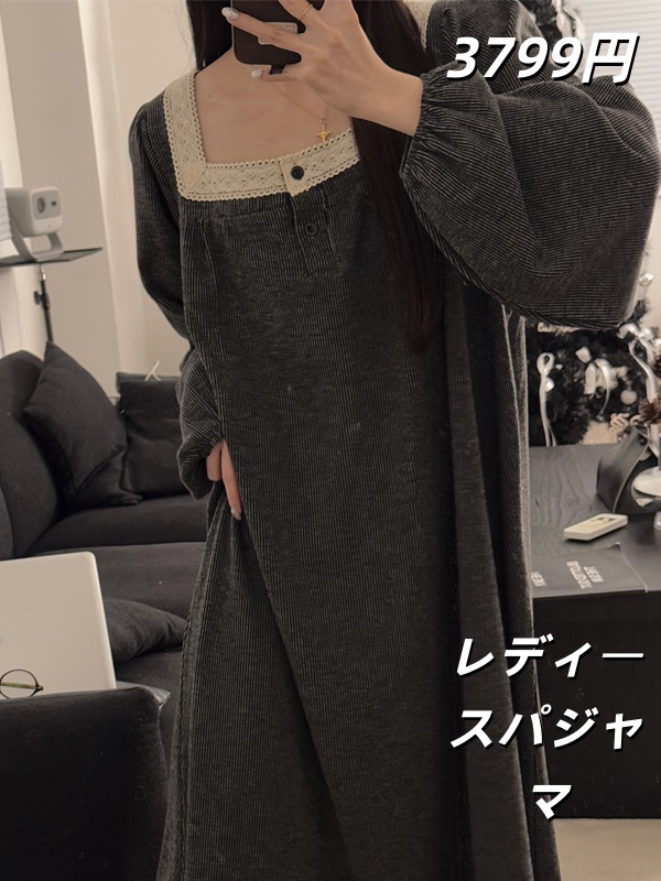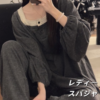 秋用中丈花边甜美长袖仿羊棉睡裙女家居服甜美花边家居服两件套